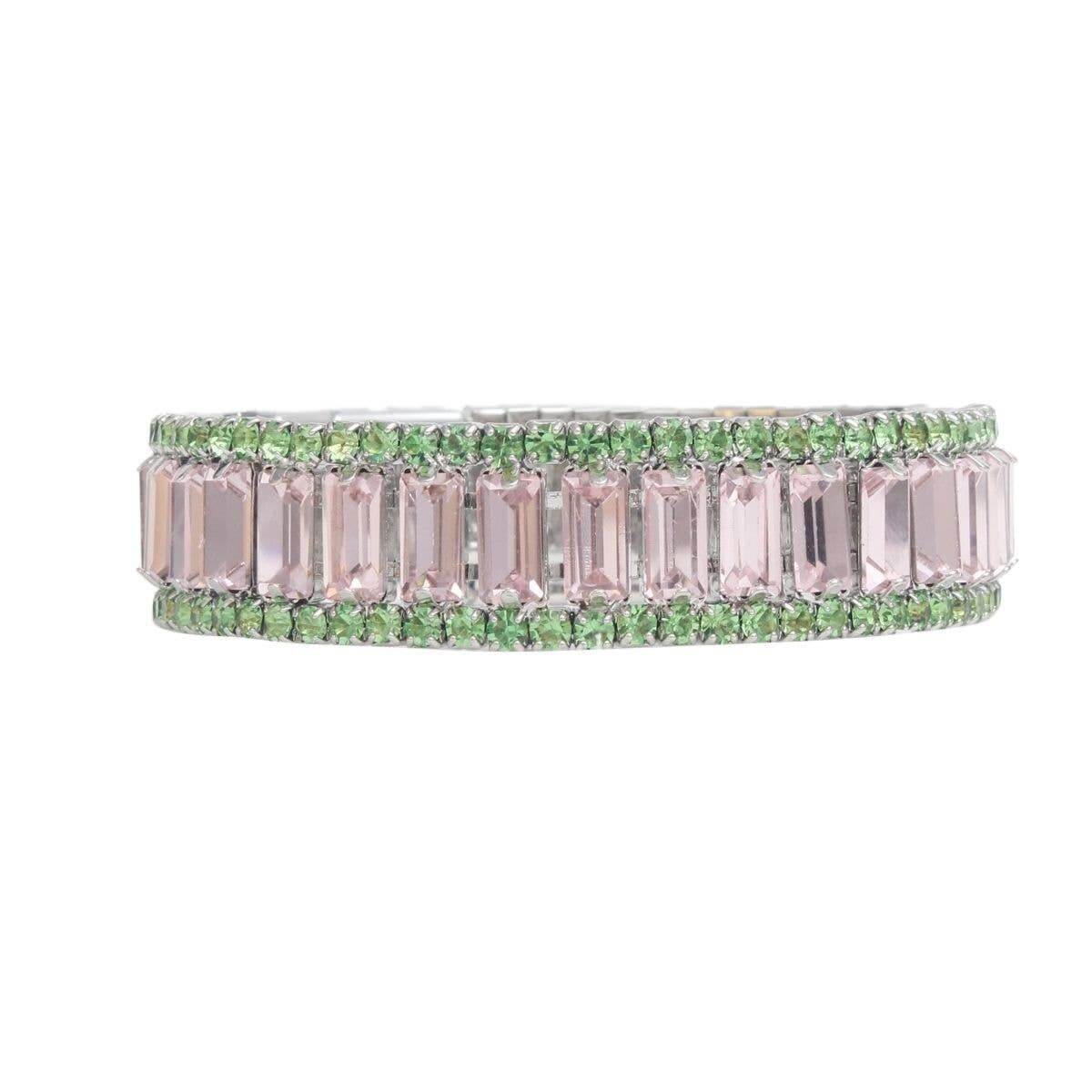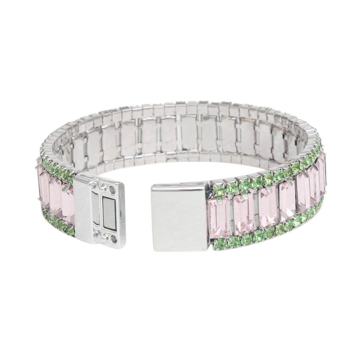 Alpha Kappa Alpha Sorority Paraphernalia Women's Tennis Bracelet. Silver Metal with Pink Baguette Crystals and Green Rhinestones Elegant Bling Tennis Bracelet. Bracelet Features Magnetic Push Closure. Bracelet Measures .7" Wide.