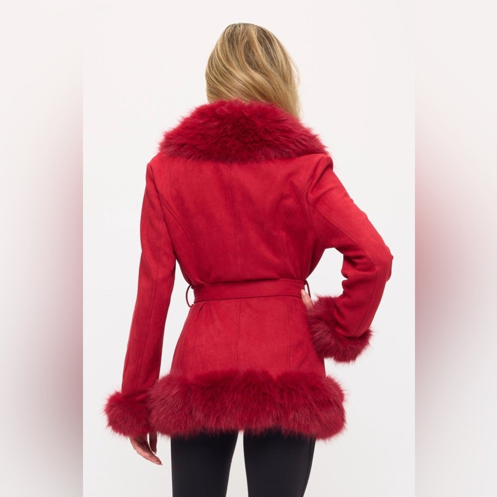 Stylish red coat with luxurious faux fur trim. Features a tie belt and zippered pockets.