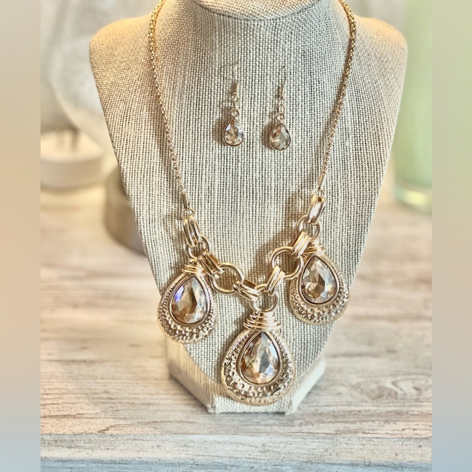 teardrop crystal jewelry, iridescent necklace set, statement jewelry, fashion jewelry set, wedding guest jewelry, rose gold tone, Poshmark accessories, Passion of Essence glam