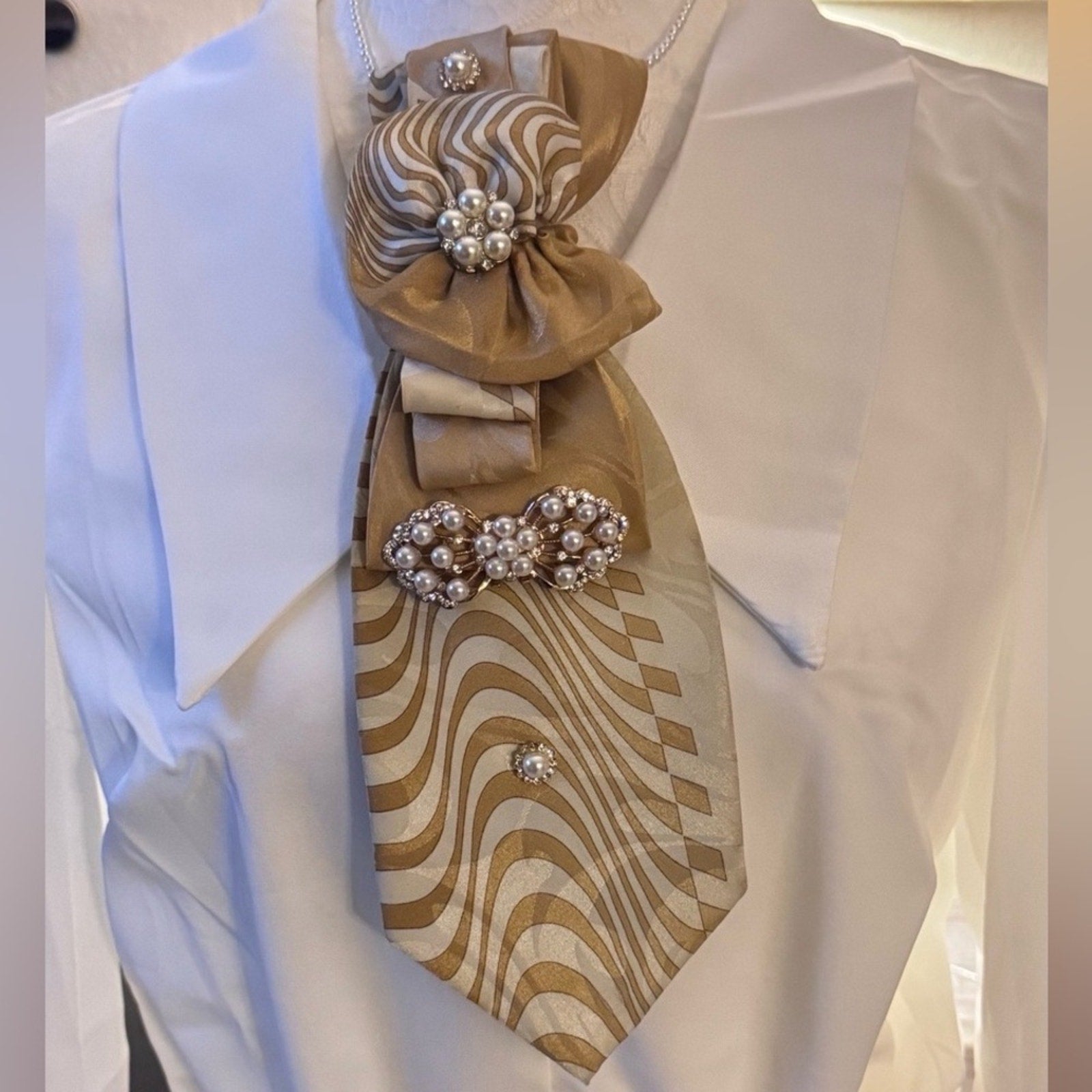 Gold Wave Pearl Statement Tie – Elegant Women’s Church & Formal Accessory