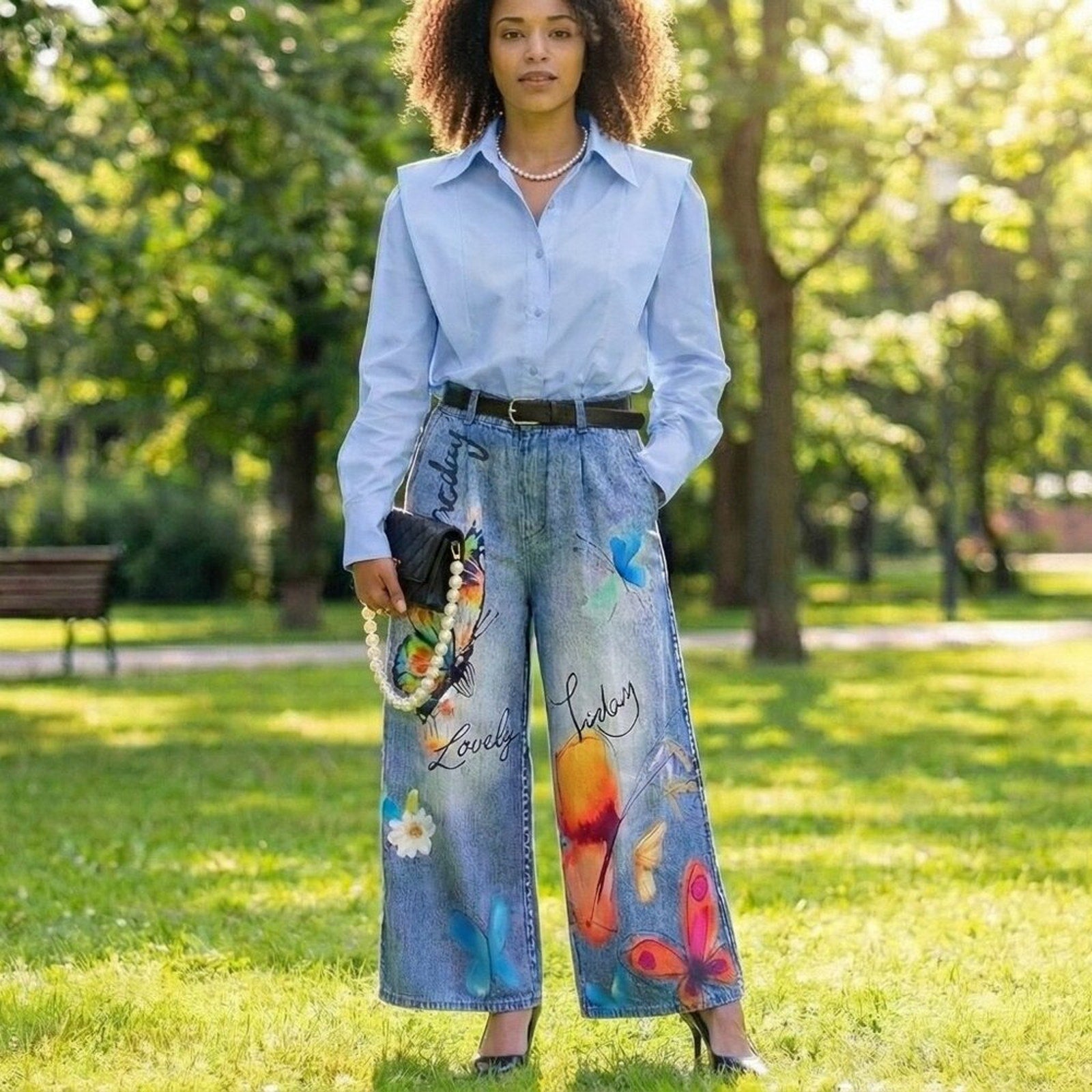 Featuring a bold butterfly placement print on soft knit denim fabric, these high-waist pants offer micro elasticity for easy movement and an effortless drape. The wide-leg silhouette flatters every curve while the comfortable elastic waistband ensures all-day wearability. Casual everyday wear that styles up fast with tees, blouses, or a blazer—no effort required.