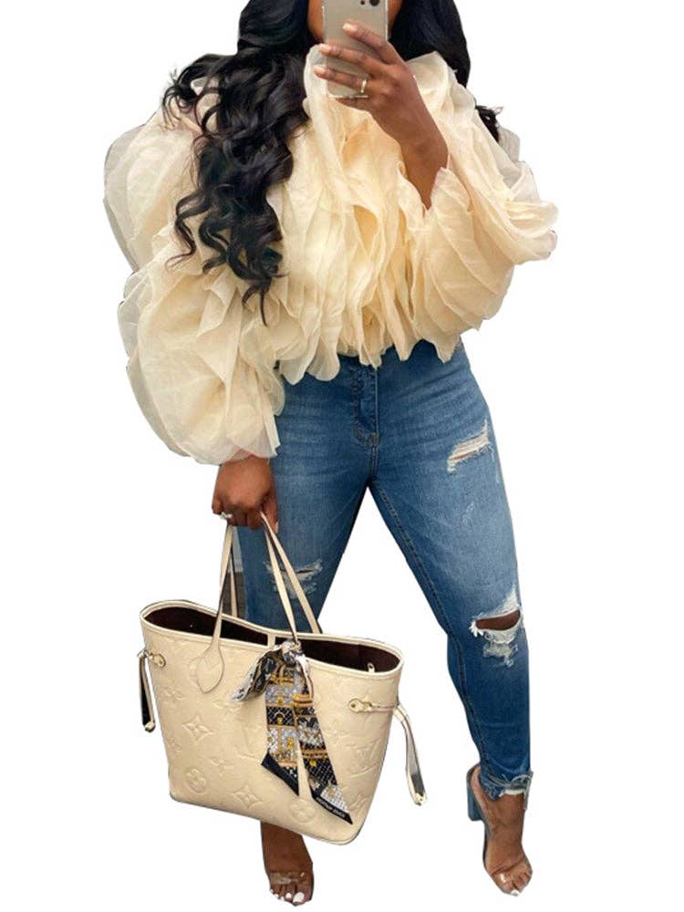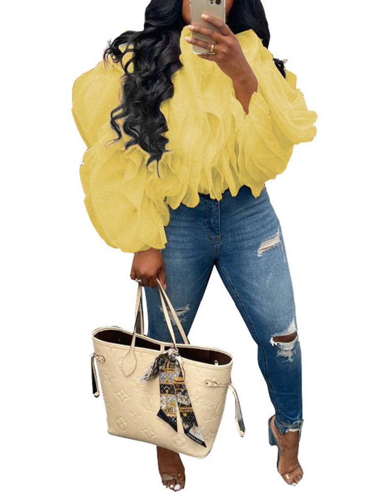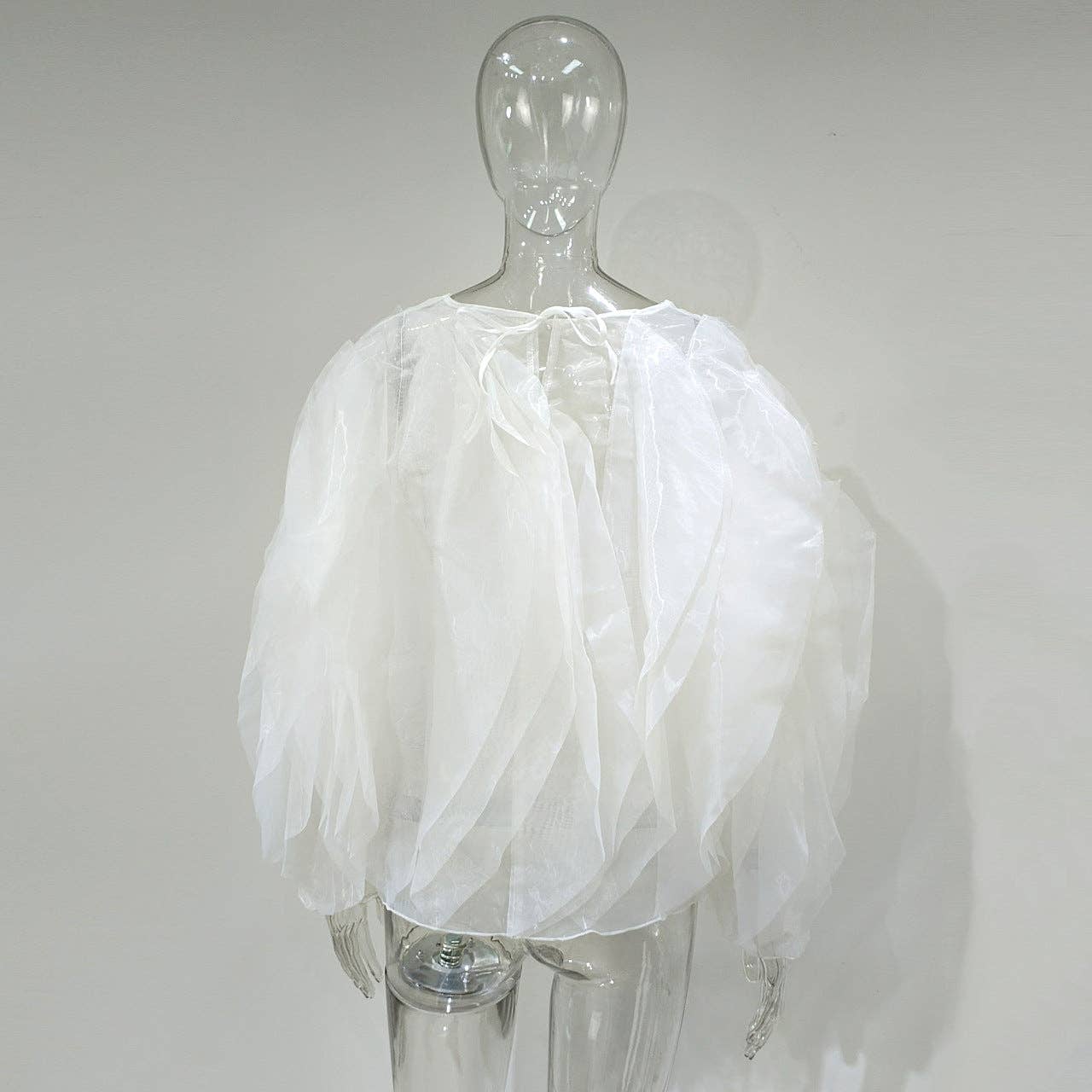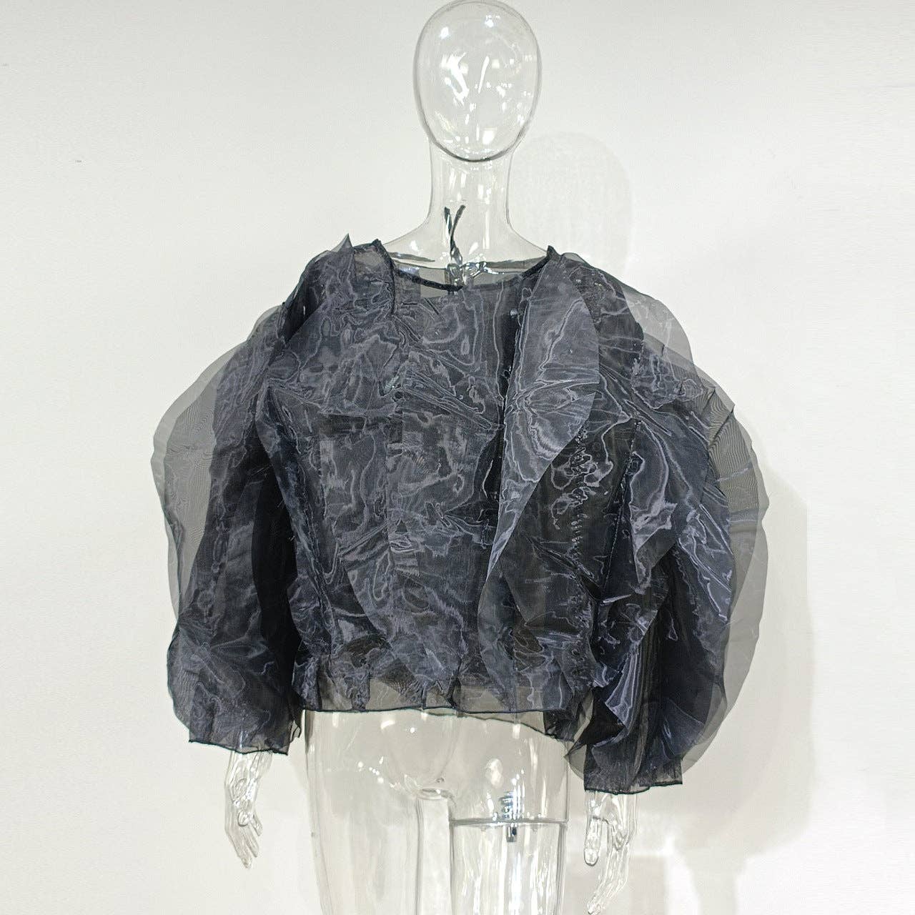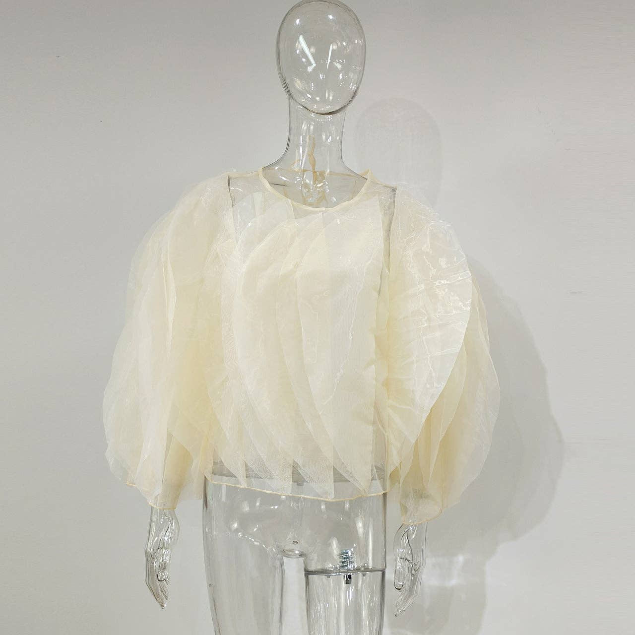 Experience the captivating beauty of our sheer, voluminous blouse in the photo. The dramatic, puffed silhouette and lightweight, translucent fabric create a layered, airy effect that is both bold and ethereal.