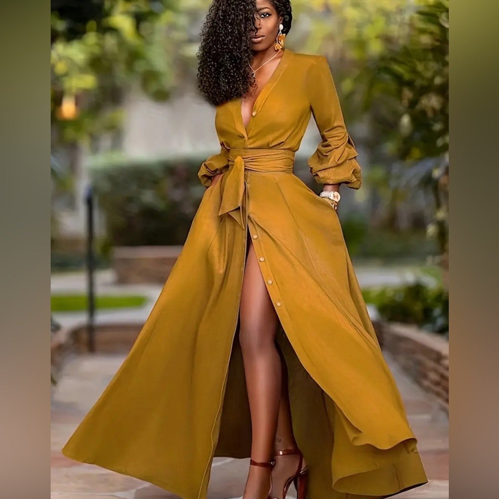 mustard yellow maxi dress, belted shirtdress maxi, button down yellow dress XL, polyester long sleeve maxi, chic statement maxi dress, yellow collared shirtdress, elegant yellow dress women, mustard yellow belted dress XL, flowy yellow maxi 2025, timeless yellow occasion dress