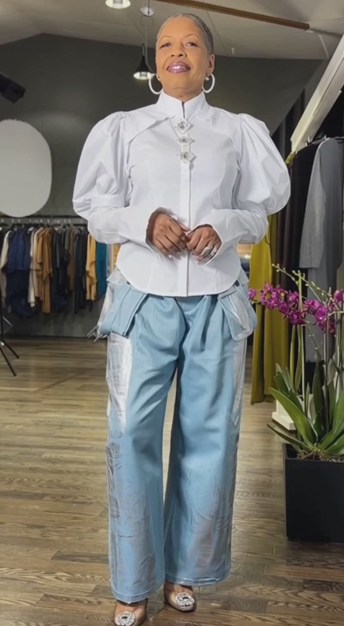 Elevate your wardrobe with this stunning pink puff sleeve diamond top, a sophisticated button-down blouse that perfectly blends romantic elegance with modern style. Crafted from a premium cotton blend, this versatile top features dramatic puff long sleeves, a timeless collar, and three exquisite diamond-rhinestone buttons that add just the right amount of sparkle to any outfit.