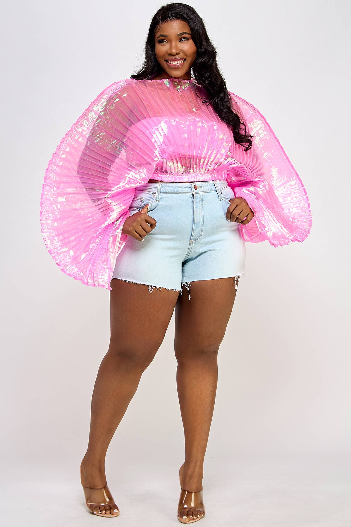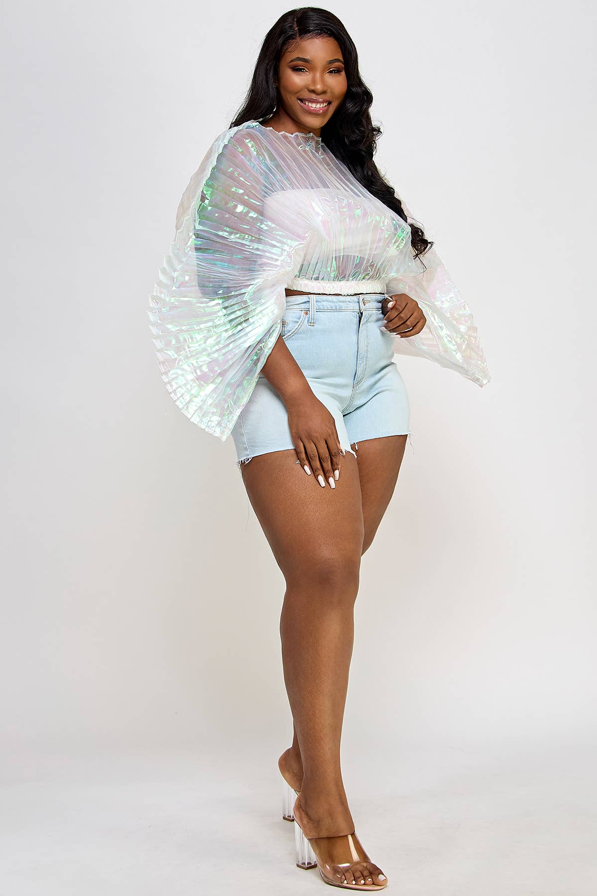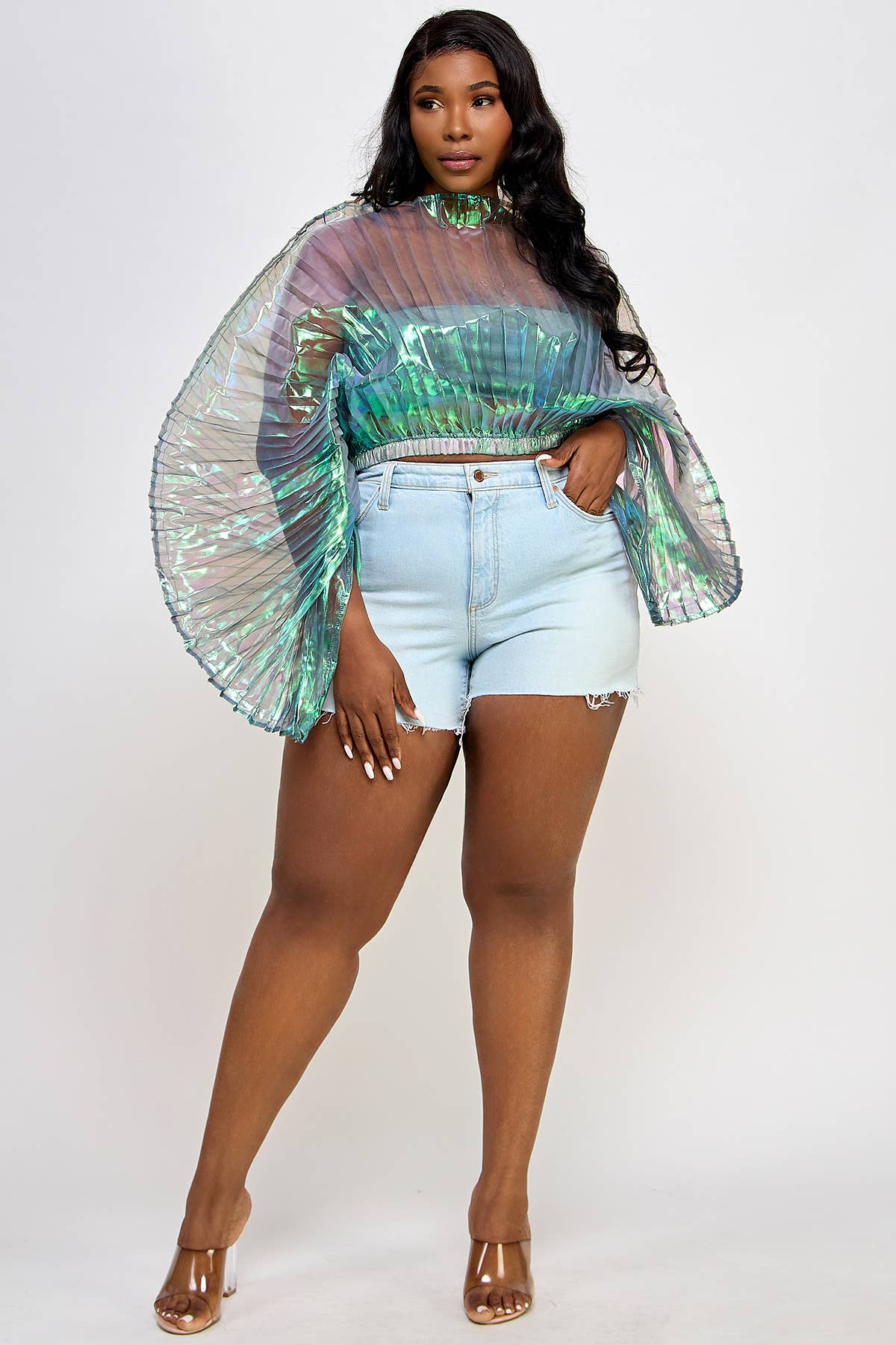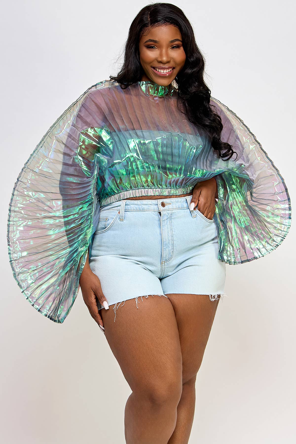 Long Sleeves Billowing Pleated Sheer Crop Top & Tube Inner Top Set, * Long Sleeve, * Billowing Pleated, * Sheer, * Crop Top, * Blouse Top, * Tube Inner Top Set, * Plus Size Pattern: Solid Length: Long Sleeve Style: Pleated Body Size: Plus