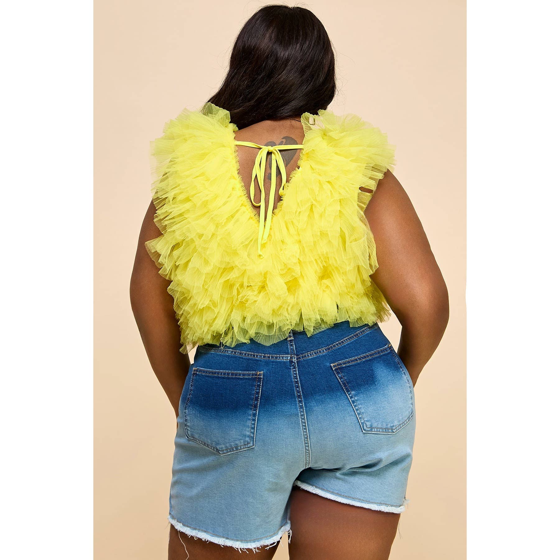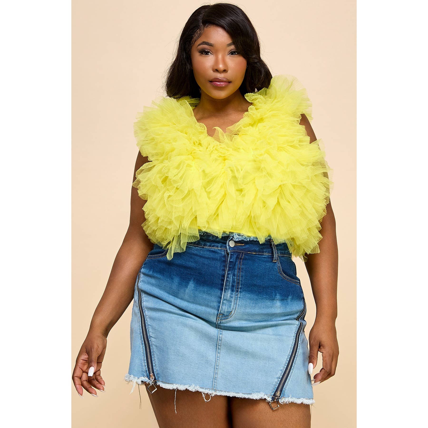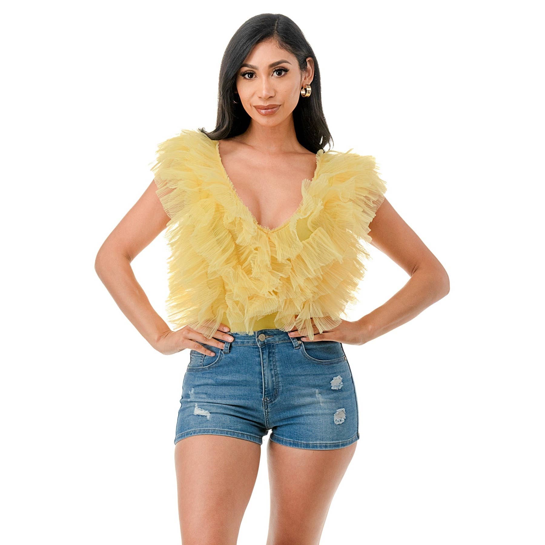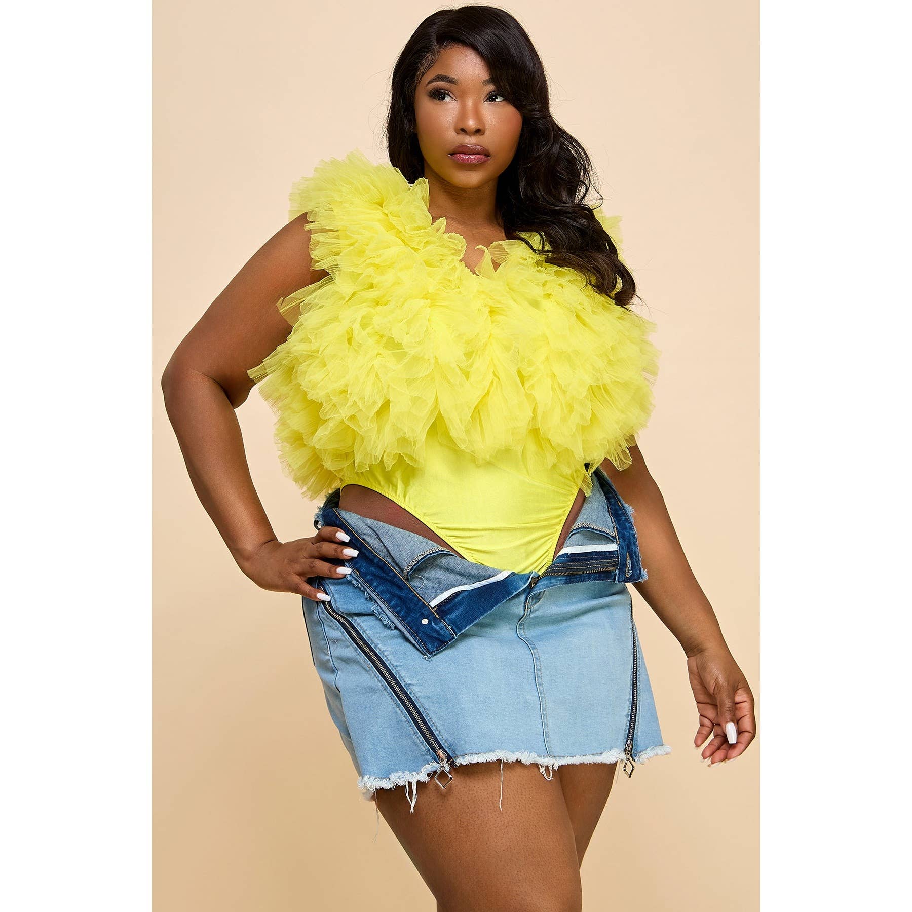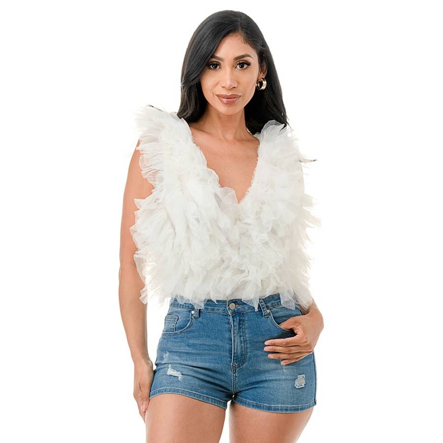 - Style No.: DT063XH1-W. PLUS Deep V-Neck Sleeveless Ruffle Detail Bodysuit