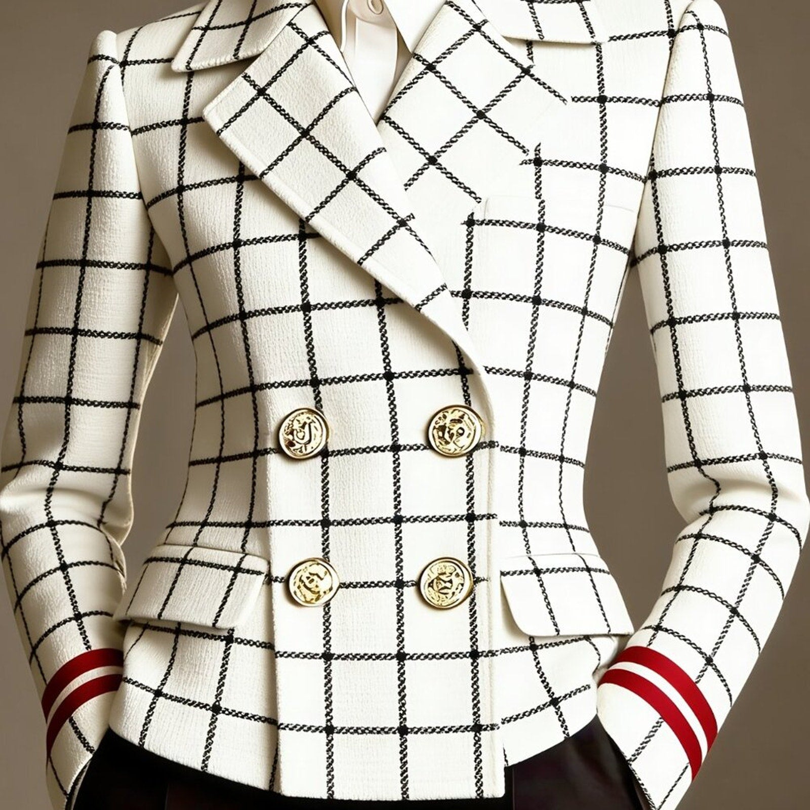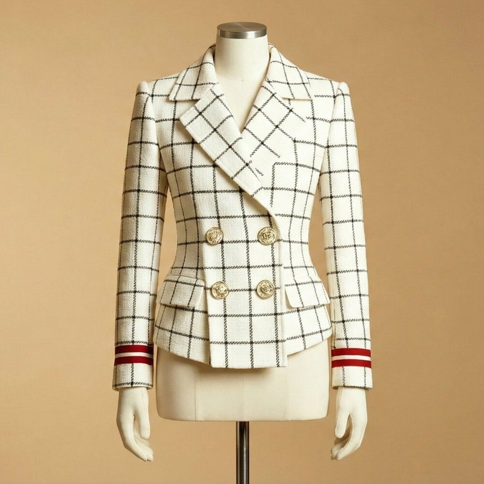 White Windowpane Check Double-Breasted Blazer | Gold Buttons + Red Cuff Stripes